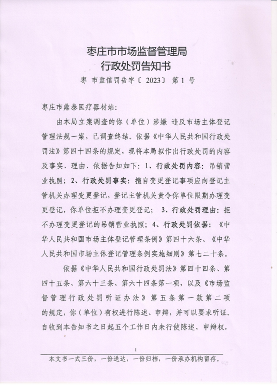 枣庄市市场监管局行政处罚告知书 枣市监信罚告字〔2023〕第1号